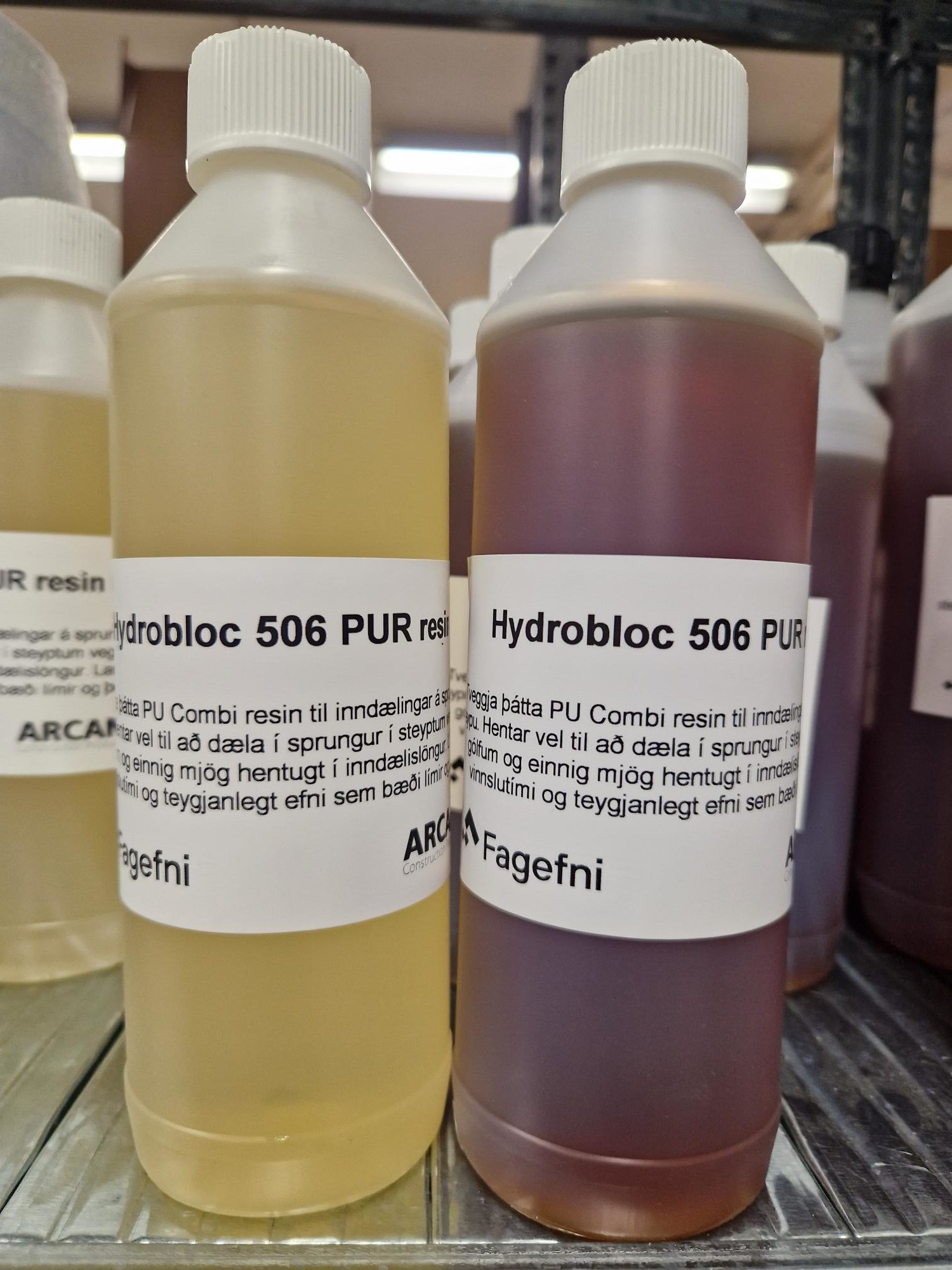 Hydrobloc 506 PUR resin 2 kg. Tveggja þátta PU Combi resin til inndælingar á sprungum í steypu. Blandast ú hlutföllum 1:1 og hefur góðan vinnslutíma. Þenst ekki út í vatni og hentar vel í inndælingaslöngur og í sprungur í útveggjum steypu. Smýgur vel.
