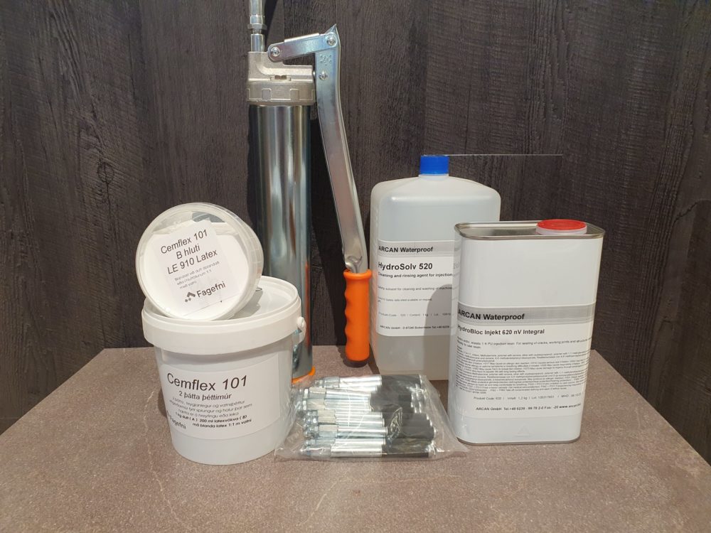 Allt sem þú þarft til að laga sprunguna eða plötuskilin sem leka. Arcan Hydrobloc 620 einþátta inndælingarefni 1.2 kg. Þenur sig út í teygjanlegt frauð. E-620 Integral hydroactive PUR Foam 20 Inndælingarnipplar standard 10 x 110 mm. Umeta sprauta fyrir resin efni. Með slöngu og kúplingu sem passar á nippla. Arcan 520 hreinsir sem hreinsar sprautu eða fleti sem smitast ef inndælingarefnum Velosit 202 viðgerðarmúr í göt og sprungur eftirá. Við eigum einnig SDS bor 10 x 260 mm sem hentar í verkið – sjá hér https://fagefni.is/product/triojet-sds-bor-10-x-260/ Arcan 620 Tækniblað E- Integral short – PU resin 1 C. tmd Verð:…