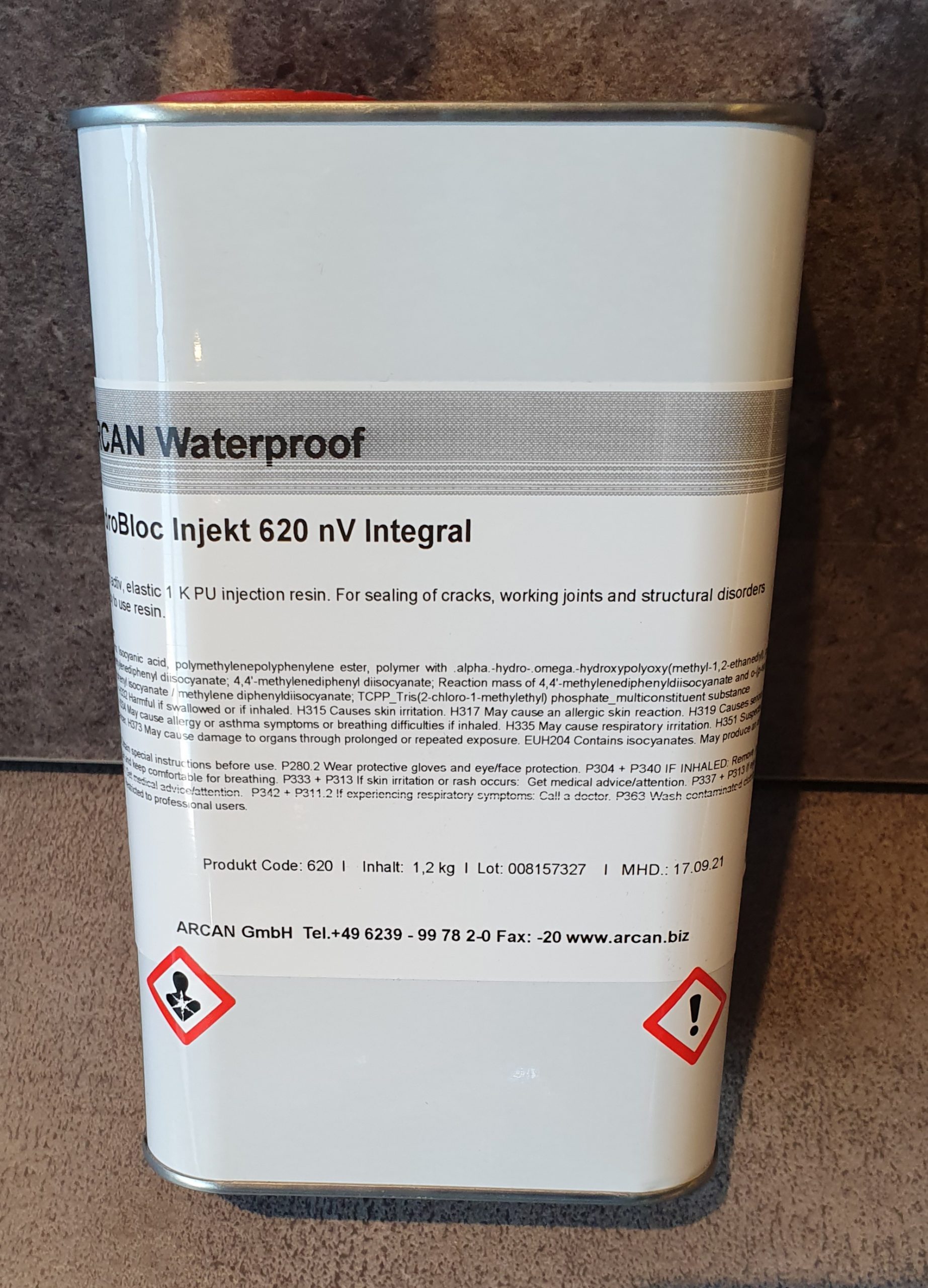 Hydrobloc Intergral 620 1,2 kg. Einþátta Integral inndælingarefni til að þétta og loka sprungum. Þenst lítillega út í sterkt , teygjanlegt frauð. Þægilegt í notkun , hefur góðan vinnslutíma og hægt að nota við kaldar aðstæður.