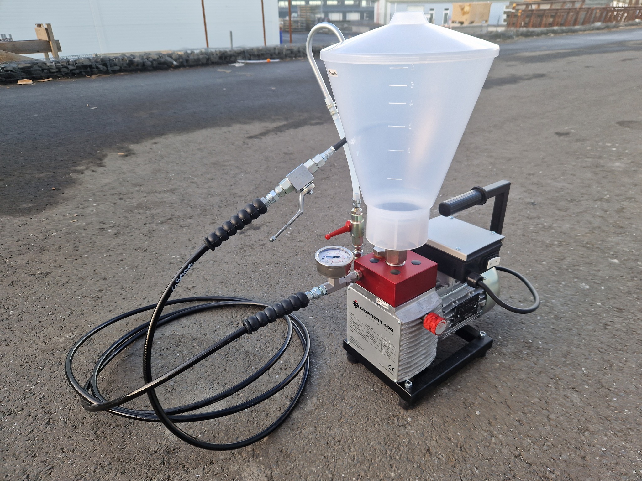 Öflug en handhæg rafmagnsdæla fyrir inndælingarí slöngur , sprungur , plötuskil eða þéttingar í jarðgöngum og bergi. Afkastar 4 l / mín og maður getur unnið með dæluna. 6 L tankur , 75 Db hljóð í mótor , þyngd 25 kg.