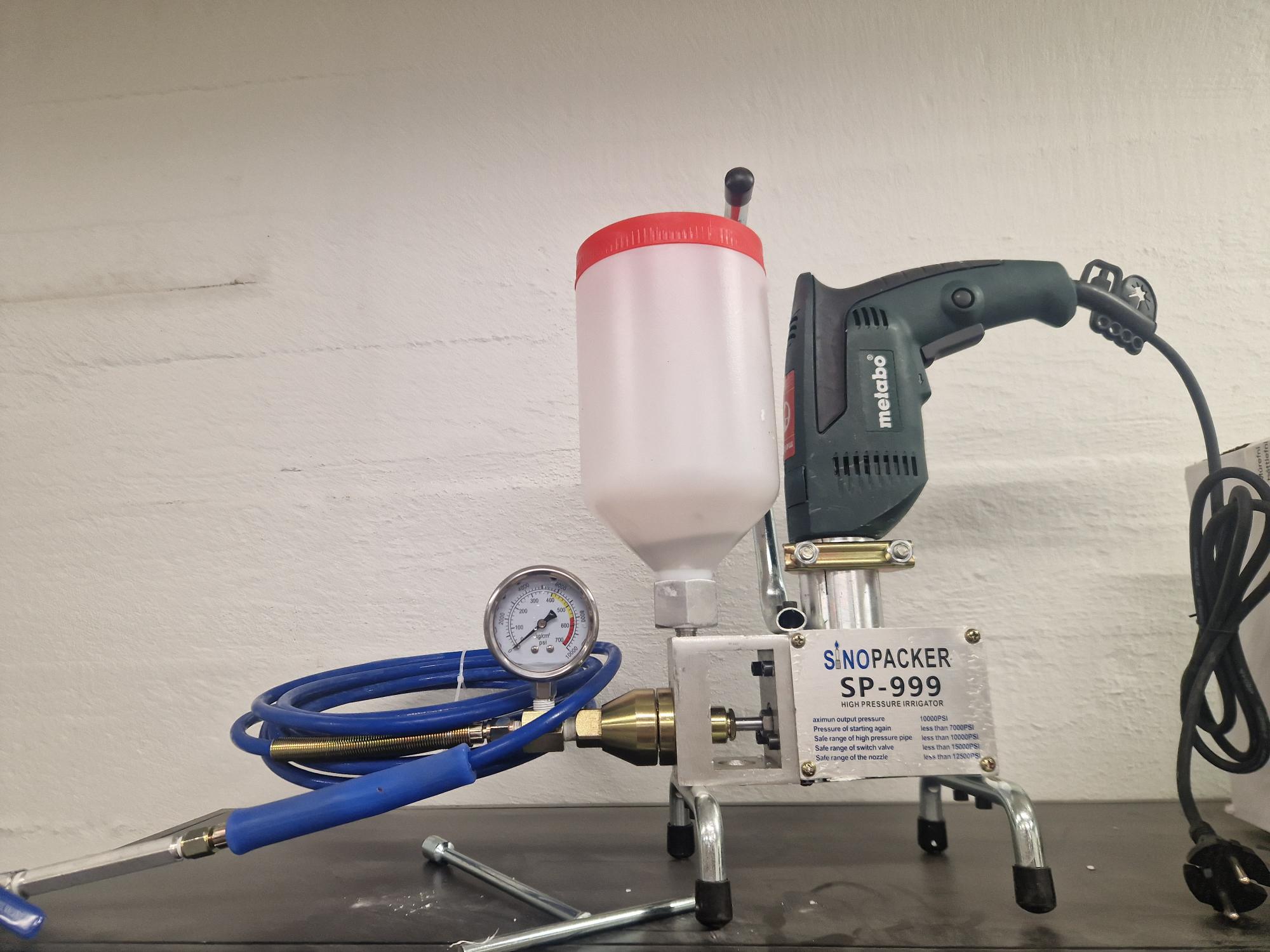 Handhæg rafmagnsdæla fyrir inndælingarefni. 3 m slanga og viðeigandi kúpling og krani fylgja. Nær meiri þrýstingi og betri árangri en handdæla.