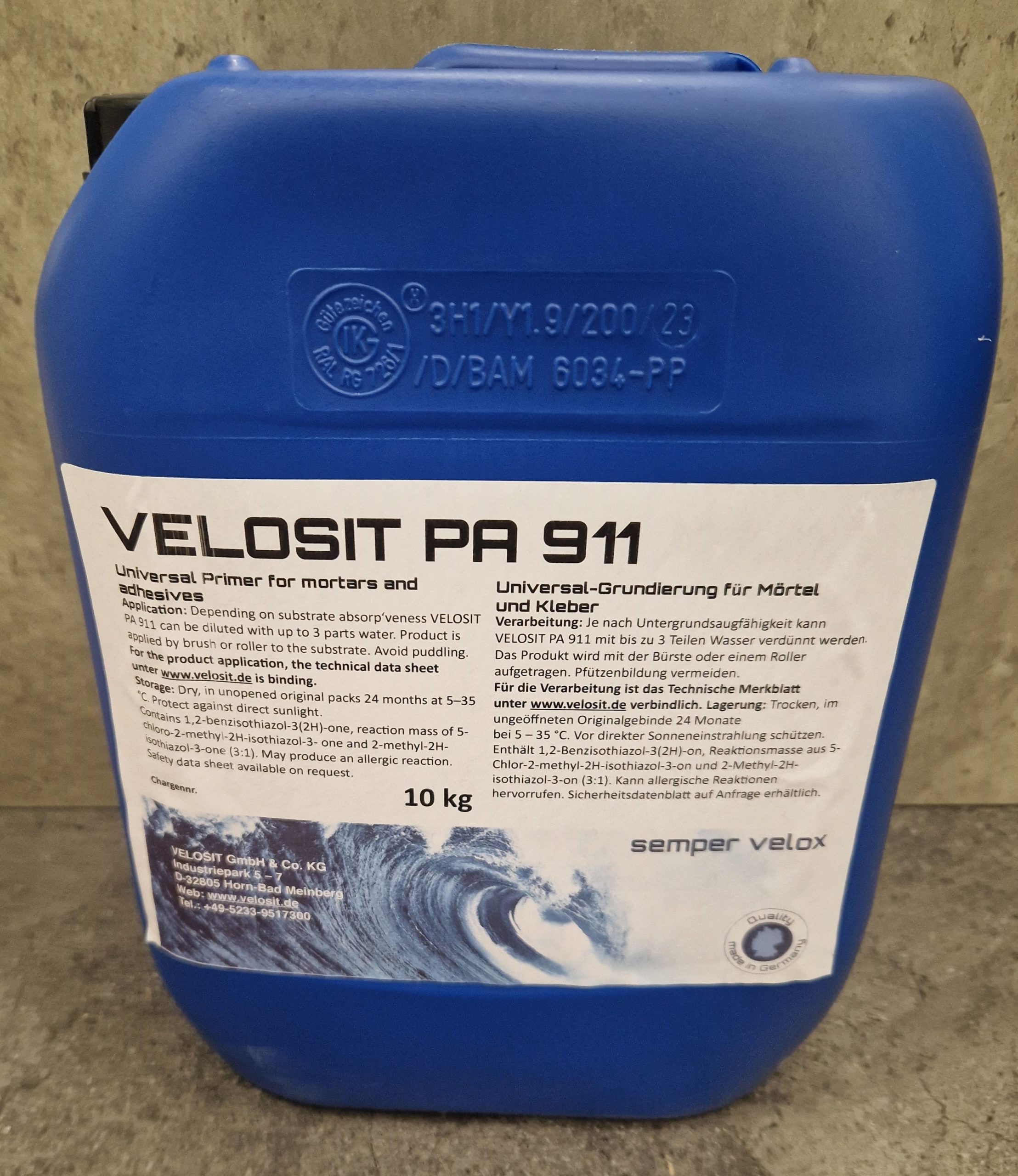 Velosit PA 911 Acryl grunnur 10 kg. Bindigrunnur fyrir múrefni , flotegni og flísalím. Blandist í hlötföllunum 1:3 með vatni. Ef undirlagið drekkur mikið eða hratt í sig er mælt með 2 umferðum.