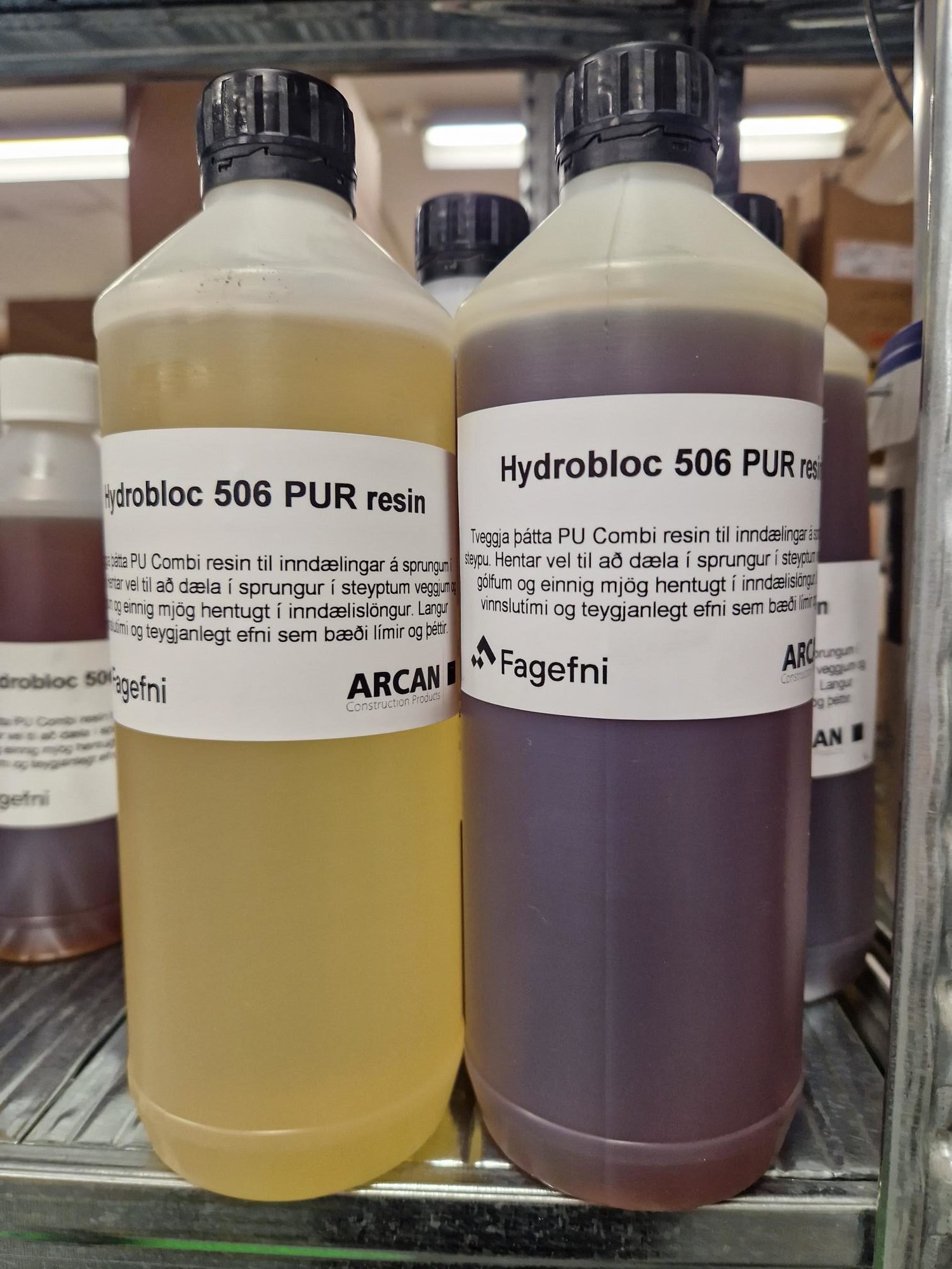 Hydrobloc 506 PUR resin 2 kg. Tveggja þátta PU Combi resin til inndælingar á sprungum í steypu. Blandast ú hlutföllum 1:1 og hefur góðan vinnslutíma. Þenst ekki út í vatni og hentar vel í inndælingaslöngur og í sprungur í útveggjum steypu. Smýgur vel.