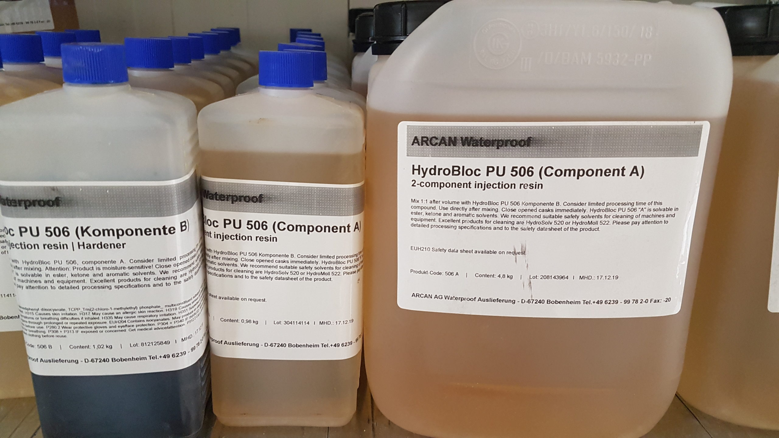 Hydrobloc 506 PUR resin 20 kg. Tveggja þátta PU Combi resin til inndælingar á sprungum í steypu. Hentar vel til að dæla í sprungur í steyptum veggjum og gólfum og einnig mjög hentugt í inndælislöngur. Langur vinnslutími og teygjanlegt efni sem bæði límir og þéttir.