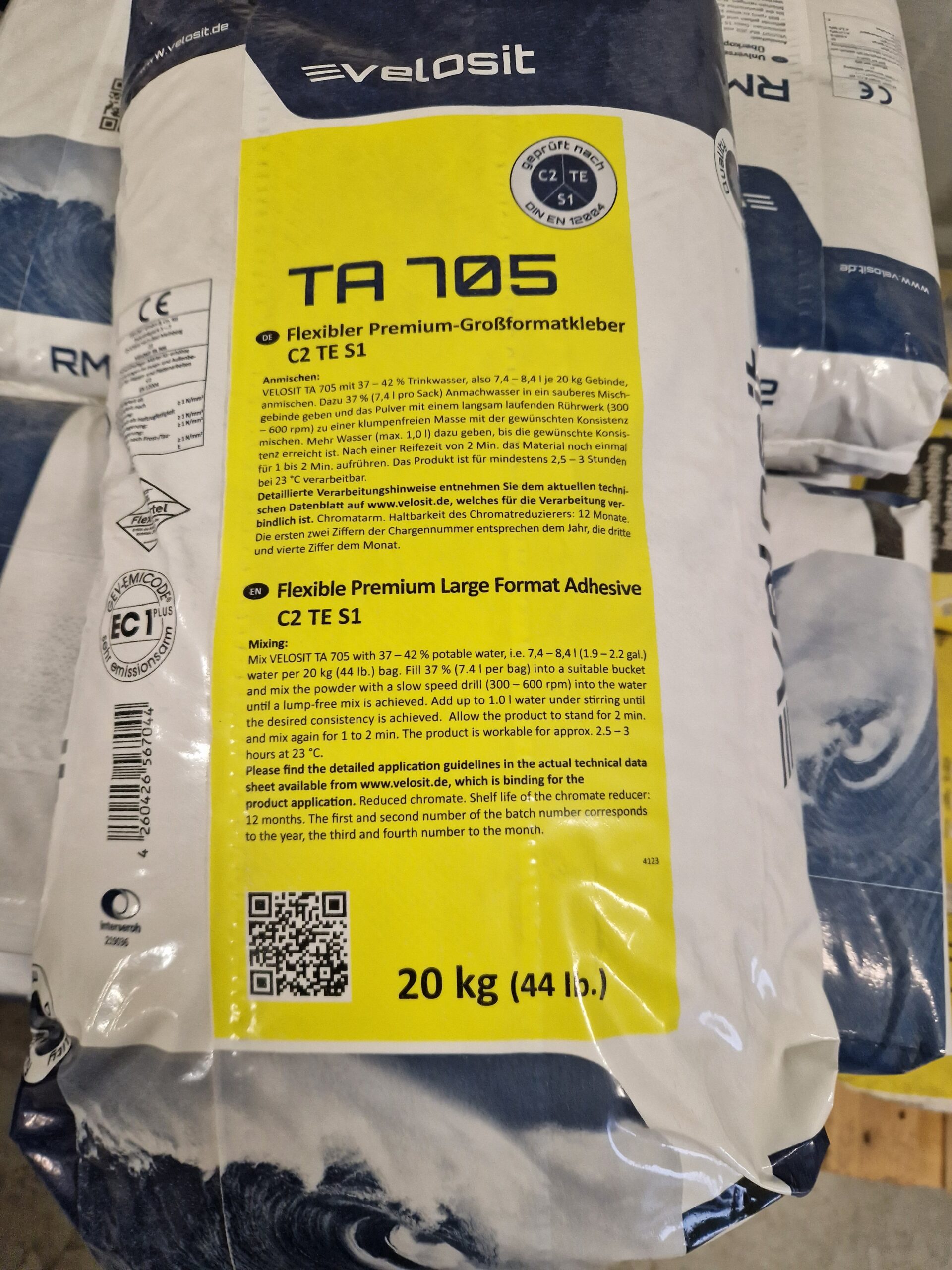 Velosit TA 705 C2 er alhliða flísalím sem hentar sérstaklega fyrir stórar flísar. Góður opnunartími Gönguhæft eftir 14 klst. Blöndun 7,4 – 8,4L af vatni í 20kg poka. Vinnslutími 2,5-3klst Heimasíða Velosit Tækniblöð