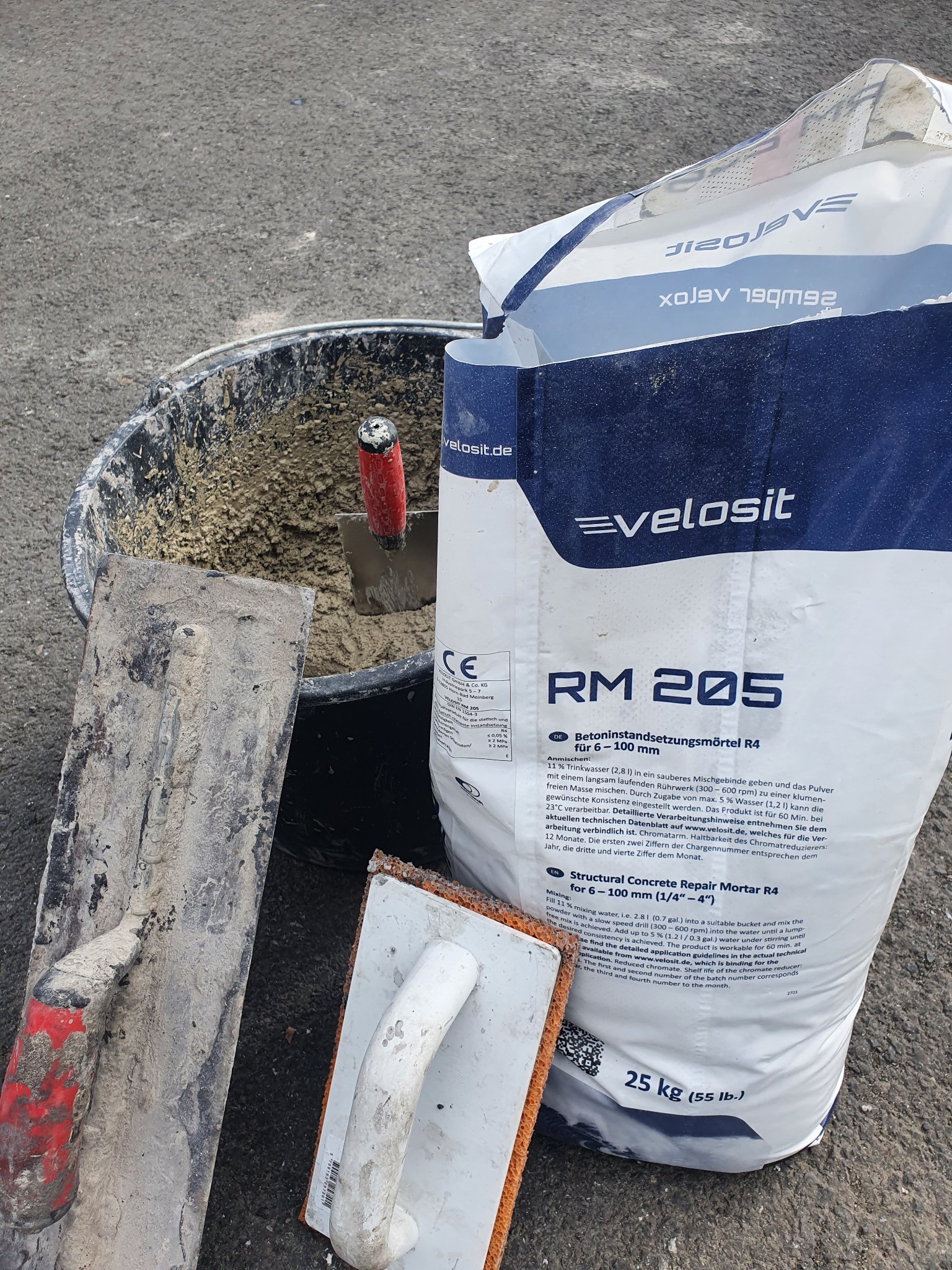 Velosit RM 205 er trefjastyrktur viðgerðarmúr með þykktarsvið frá 6 – 100 mm. Hentar vel til að gera við þykka gluggakanta , jafna út stærri svæði og gera við brotin stykki í brúm , svölum , bitum og fl. 60 mín vinnslutími og harðnar á 3 – 4 klst. Inniheldur sérstaka tæringavörn. Styrkur 45 mpa