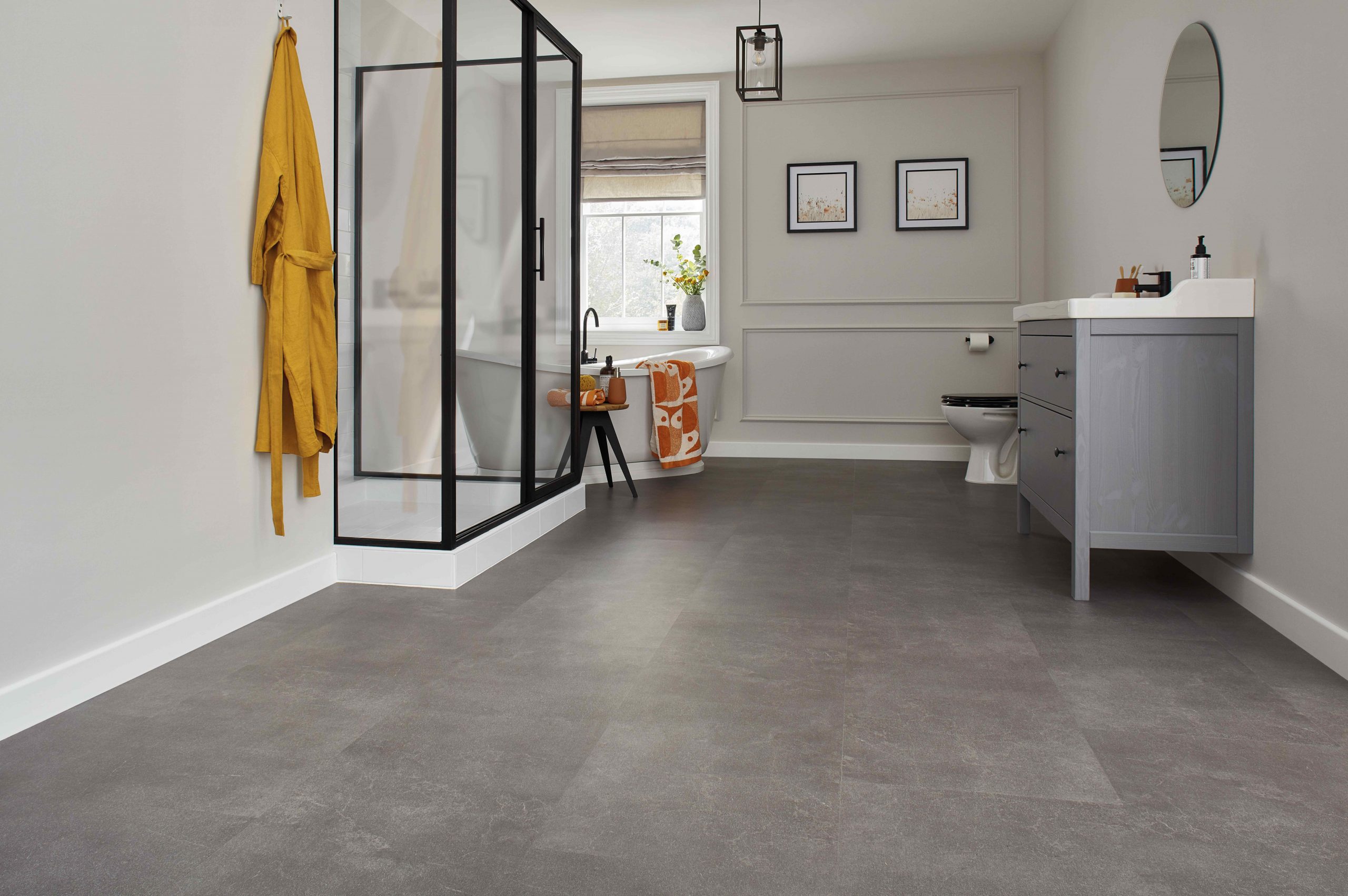 Smellt gólfefni með Náttúrusteina áferð 6,5 mm þykkt , 5G lás og áfast undirlag sem er með 21 db hljóðdempun. Stærð 45,7 cm x 60 cm. Magn í pakka 2,742 m2 . Magn á bretti 142,58 m2.